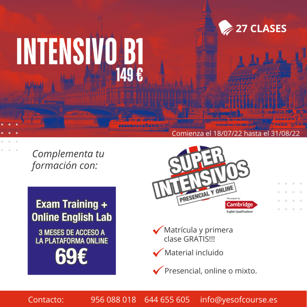 El curso INTENSIVO de B1 constan de 27 clases y está pensado ya sea para mejorar tu inglés, subir de nivel rápidamente o preparar tu examen y conseguir un título reconocido (Cambridge, Aptis, Trinity, etc.).